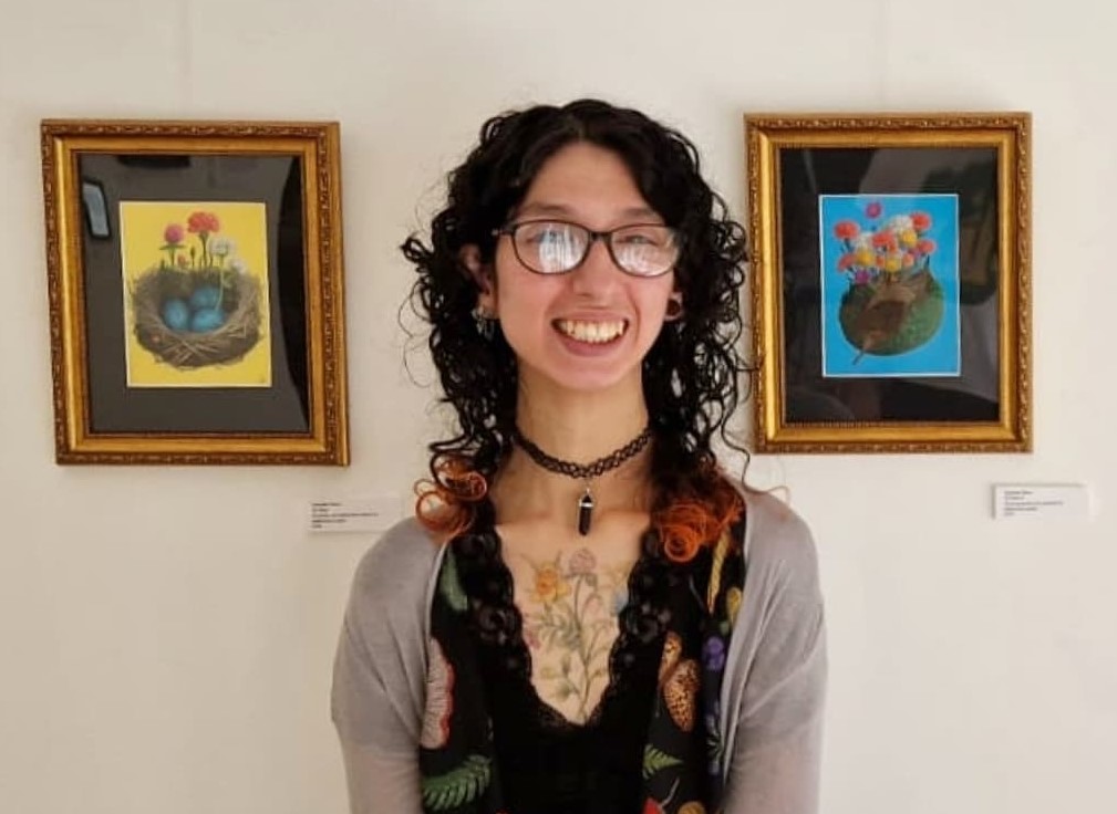 Her work focuses on the cycle of life and disability through the symbolic visual language of nature. Her pop surrealist work tends to incorporate bright colours and layers of meaning, brought to life predominantly with oil and gouache paints.